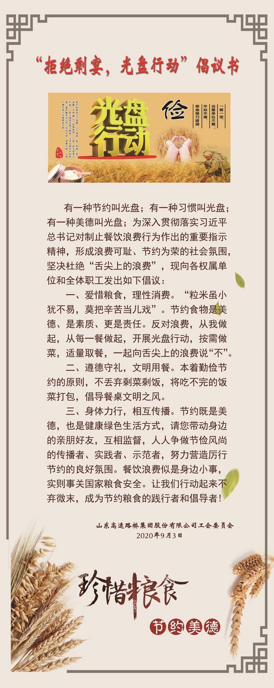 為貫徹落實習(xí)近平總書記制止餐飲浪費的指示精神,路橋股份全體職工誓將“厲行勤儉節(jié)約,反對鋪張浪費”的倡議深入開展。